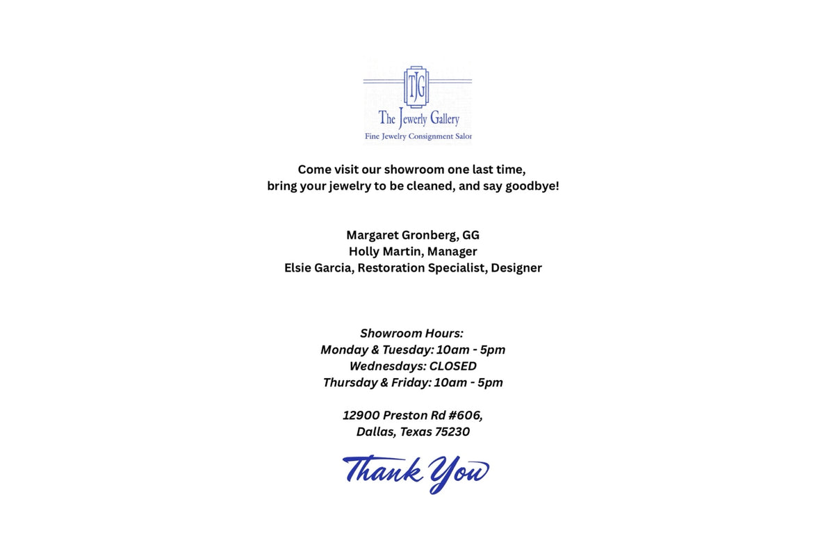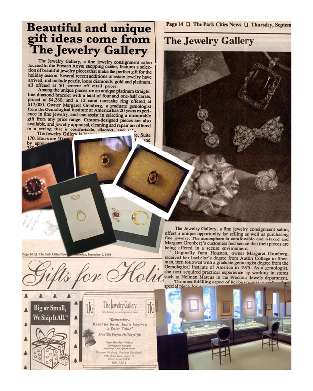 Since our inception in 1986, The Jewelry Gallery has occupied the same North Dallas location at 5924 Royal Lane, Suite 170, Dallas, TX 75230, serving our Preston/Royal community. The owner, Margaret Gronberg, is a Gemological Institute of America (GIA) Graduate Gemologist, with 40 years experience appraising jewelry. She has made a long study of period jewelry and is often a speaker and instructor on the subject. Her love of all periods of fine jewelry inspired her study of various mining, cutting and manufacturing techniques, as well as the historic impact of jewelry in fashion eras. She is a qualified expert witness in federal and state court, an accepted appraiser for federal agencies and private trust departments.
